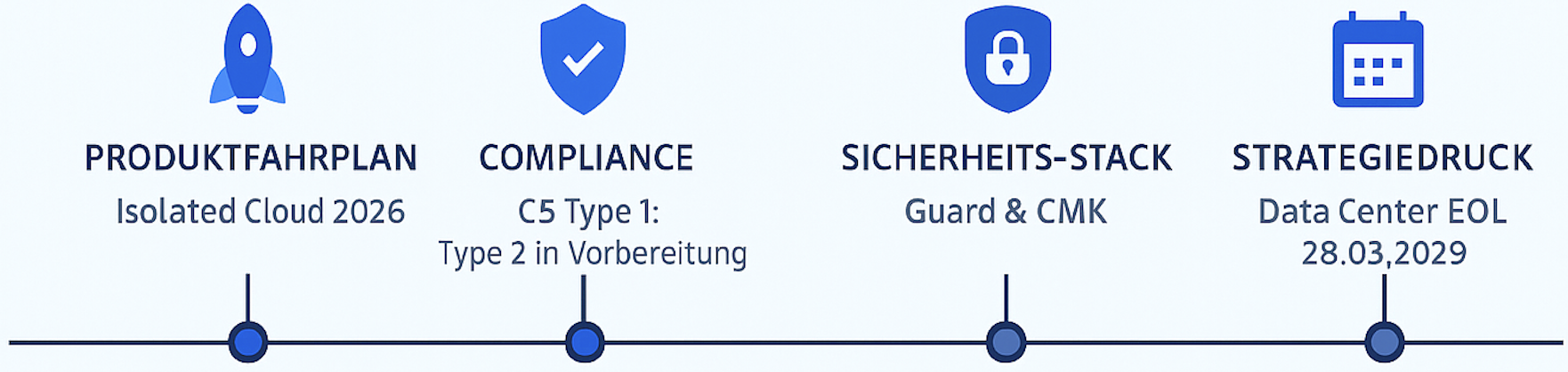 - Jetzt handeln: Daten klassifizieren, App-Landschaft prüfen, CMK-Pilot in Cloud Enterprise vorbereiten; Data Center EoL ist 28. März 2029.