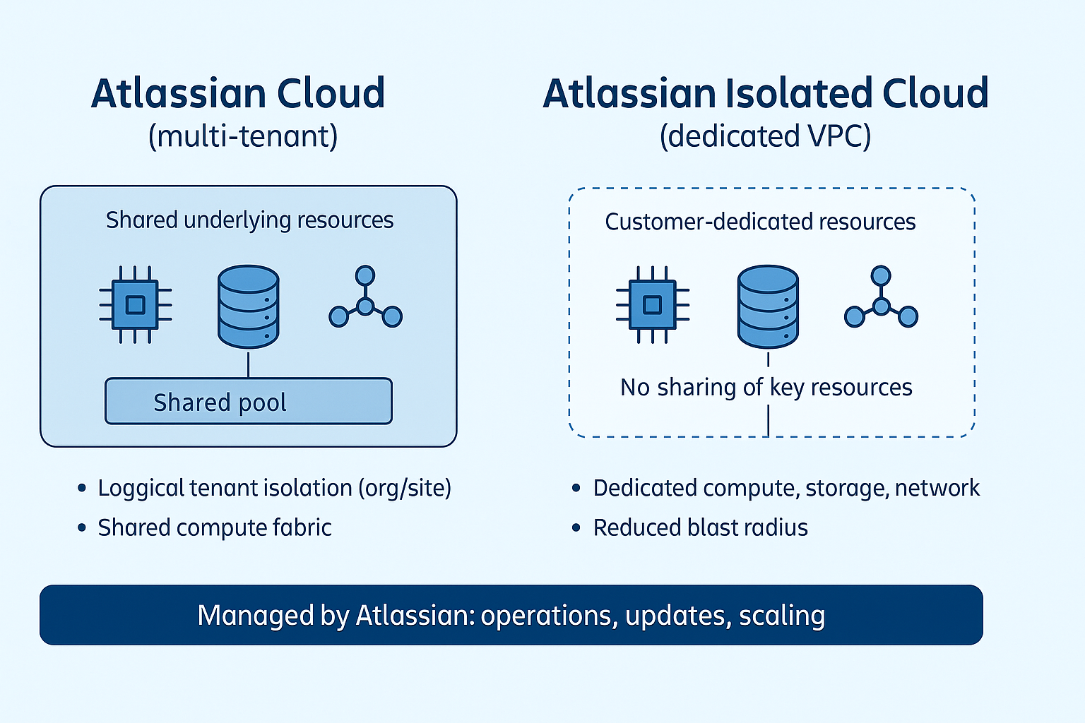 Beide Optionen sind von Atlassian gemanagte Cloud-Services. Der zentrale Unterschied: Isolated Cloud stellt Ihre Atlassian-Produkte in einer kundendedizierten VPC bereit (keine geteilten „key resources“ wie Compute/Storage/Netz), während Cloud Enterprise eine Multi-Tenant-Architektur nutzt und bei Bedarf mit Customer-managed keys (CMK) und Atlassian Guard gehärtet wird.